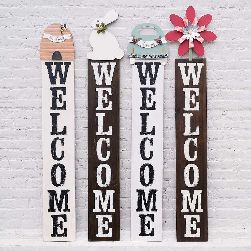 Meant to either hang on a wall or lean next to a doorway, our welcome boards will complement any style. Add a wood topper to add style for your next birthday or holiday (sold separately)! Toppers have a peg that easily slips in and out of the hole in the top of the board or stand - makes seasonal changes simple. Our wood base serves as another functional way for the toppers to add a fun accent indoors.